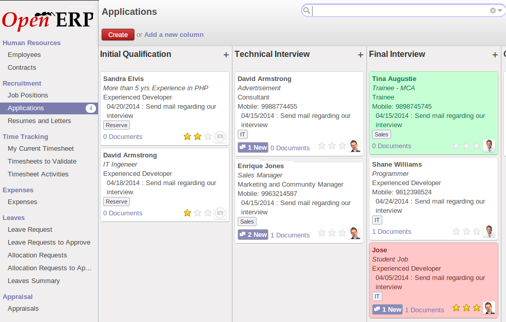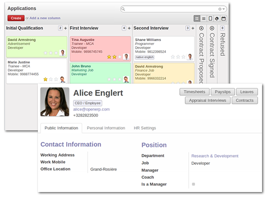Create your own hiring strategies – Odoo’s solutions for recruitment software offer great service for big as well as for small business. Use the kanban view and customize the steps of your recruitments process: pre-qualification, first interview, second interview, negotiation, …