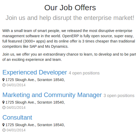 Odoo’s open source software alllows you to organize your job board, promote your job announcements and keep track of application submissions easily. Follow every applicant and build up a database of skills and profiles with indexed documents.
