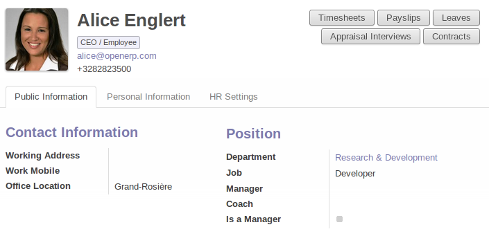 Thanks to Odoo’s HR tools, you can satisfy each one of your HR needs by a specific app that you activate on demand and all information are stored in the cloud.
